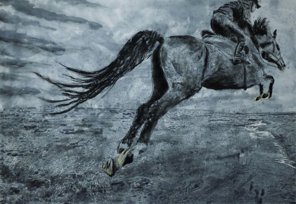 Over the past two decades, my work has explored the surreal and the dreamlike, weaving narratives of transformation. This thread feels deeply rooted in my Georgian heritage: the dragon-slaying heroes of Colchis, the protective duality of Kartlis Deda (Mother Georgia) who holds both sword and wine bowl, and the enduring connection to the land that runs through our myths and folk tales. The tactile embellishments I sometimes use—gold leaf, glued jewels, gold confetti—echo the gilded, ritualistic quality of Georgian Orthodox icons, adding layers of symbolic depth and physical presence. The scenes evoke a quiet tension, where fragility confronts vast, indifferent, or overwhelming forces, yet the figures persist with a subtle resilience or quiet agency. The emotional register is one of quiet intensity—melancholy, wonder, unease, and a faint undercurrent of defiance.