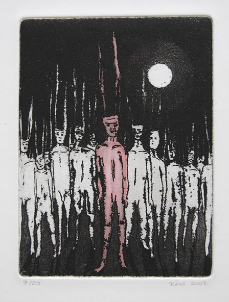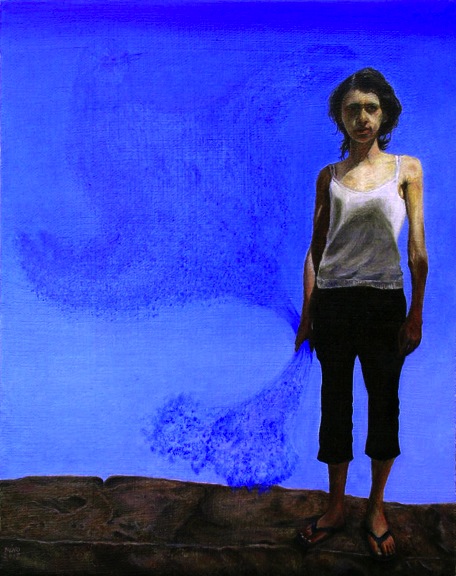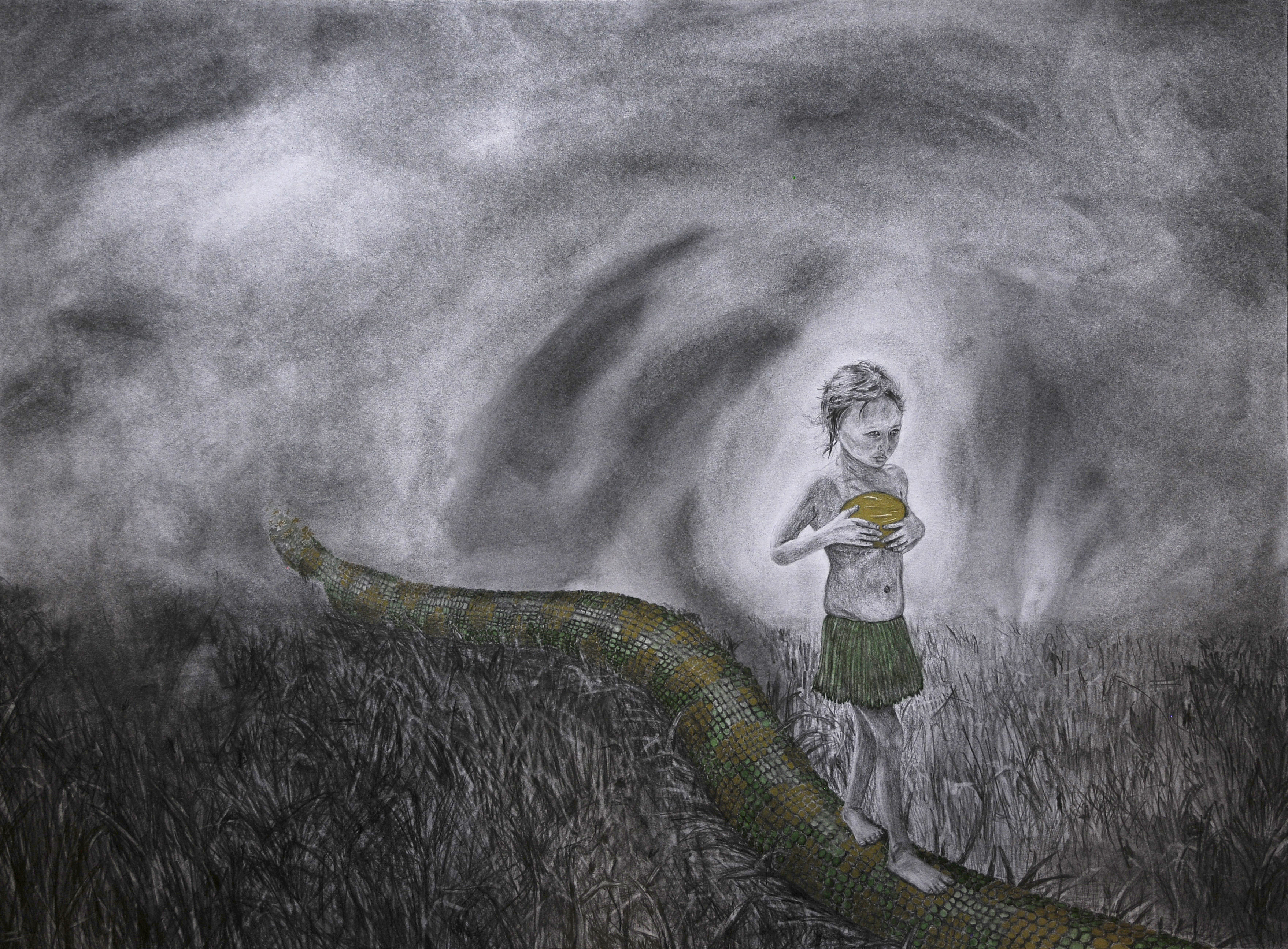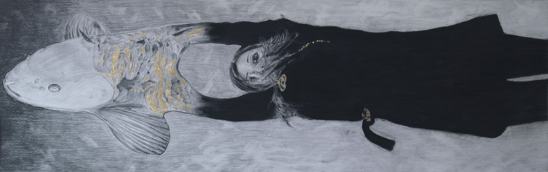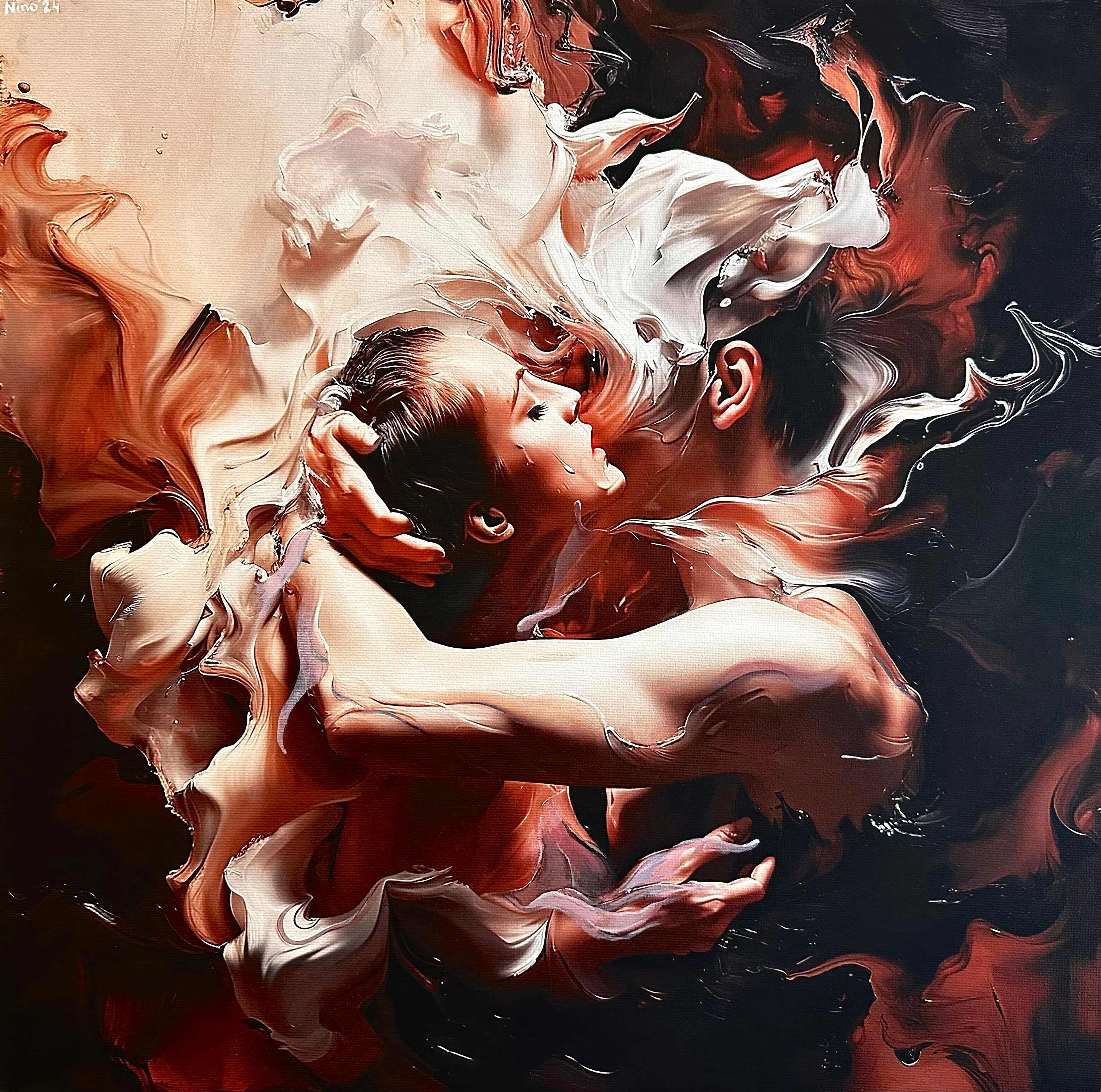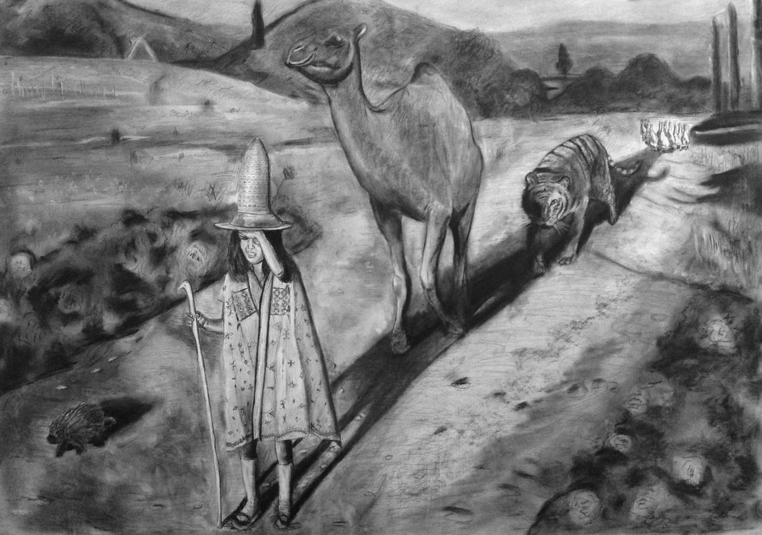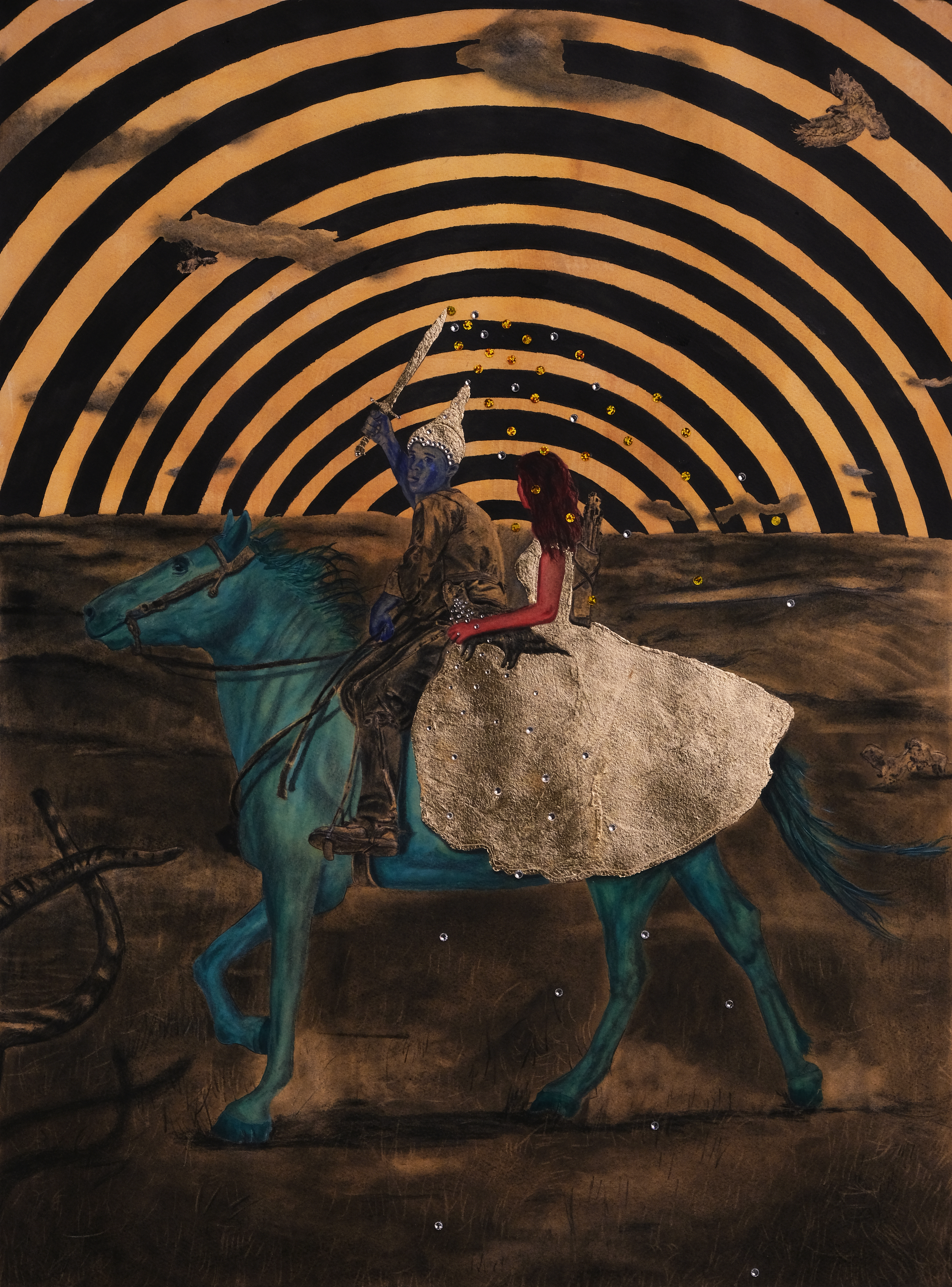 Over the past two decades, my work has explored the surreal and the dreamlike, weaving narratives of transformation. This thread feels deeply rooted in my Georgian heritage: the dragon-slaying heroes of Colchis, the protective duality of Kartlis Deda (Mother Georgia) who holds both sword and wine bowl, and the enduring connection to the land that runs through our myths and folk tales. The tactile embellishments I sometimes use—gold leaf, glued jewels, gold confetti—echo the gilded, ritualistic quality of Georgian Orthodox icons, adding layers of symbolic depth and physical presence. The scenes evoke a quiet tension, where fragility confronts vast, indifferent, or overwhelming forces, yet the figures persist with a subtle resilience or quiet agency. The emotional register is one of quiet intensity—melancholy, wonder, unease, and a faint undercurrent of defiance.